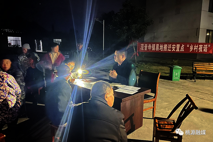 ▲鎮(zhèn)黨委書記張耿在安置點主持“鄉(xiāng)村夜話”活動